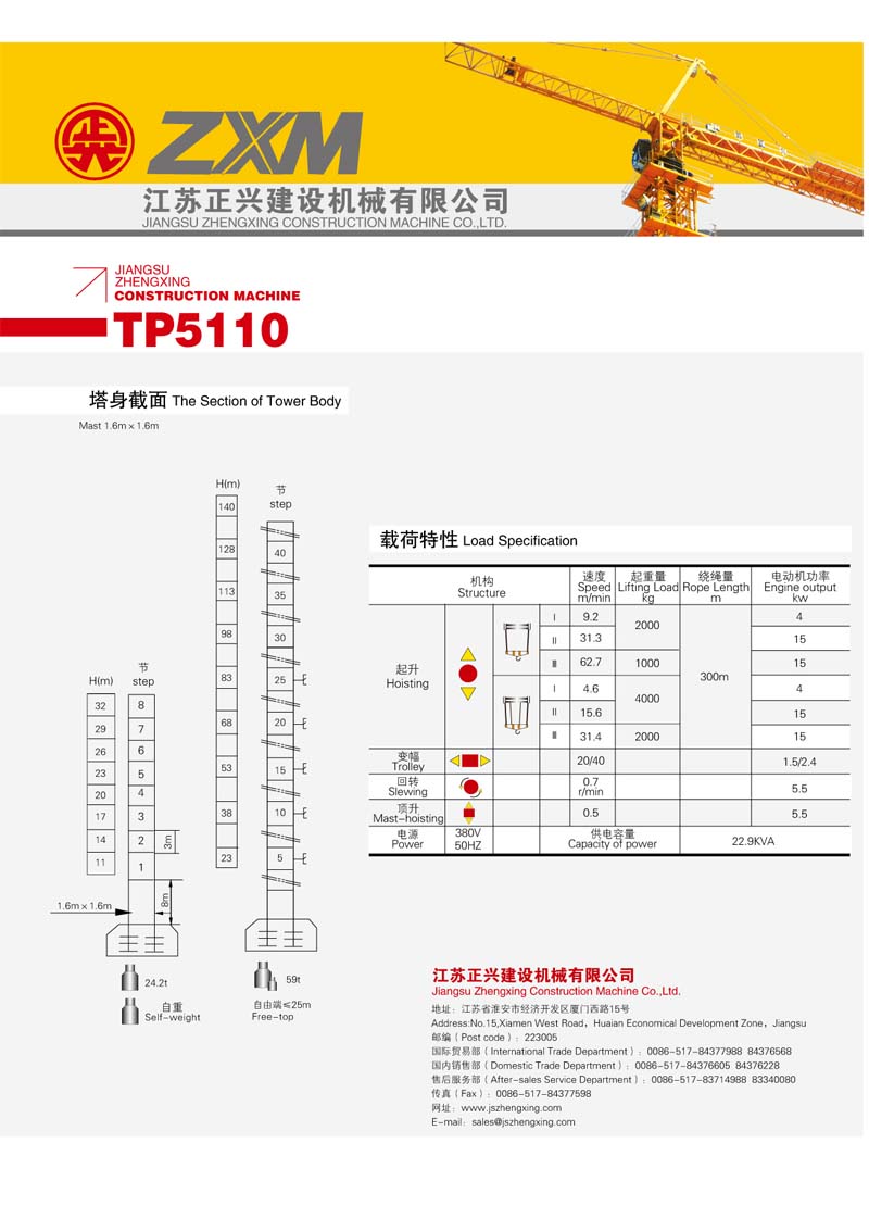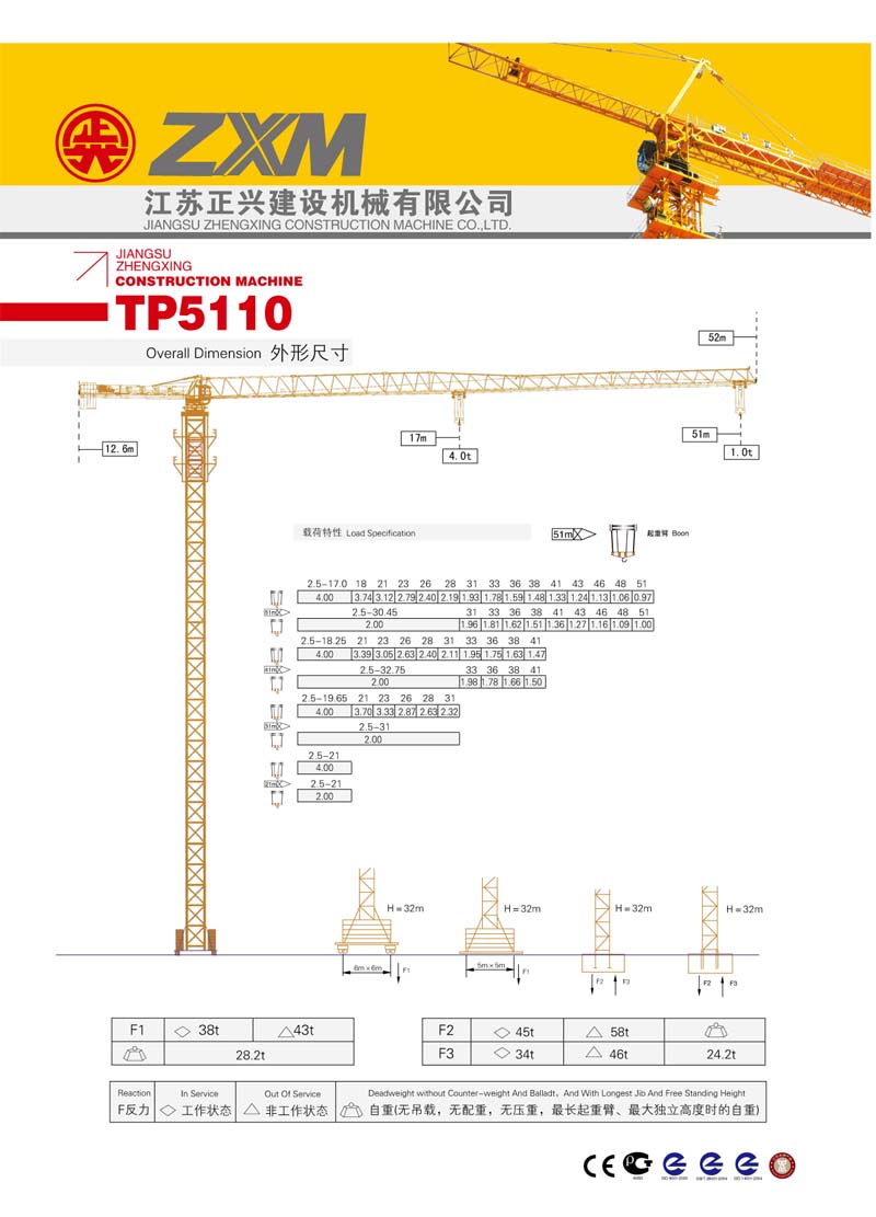 2、最大工作幅度51米,最大起重量4噸,末端最大起重量1.0噸;