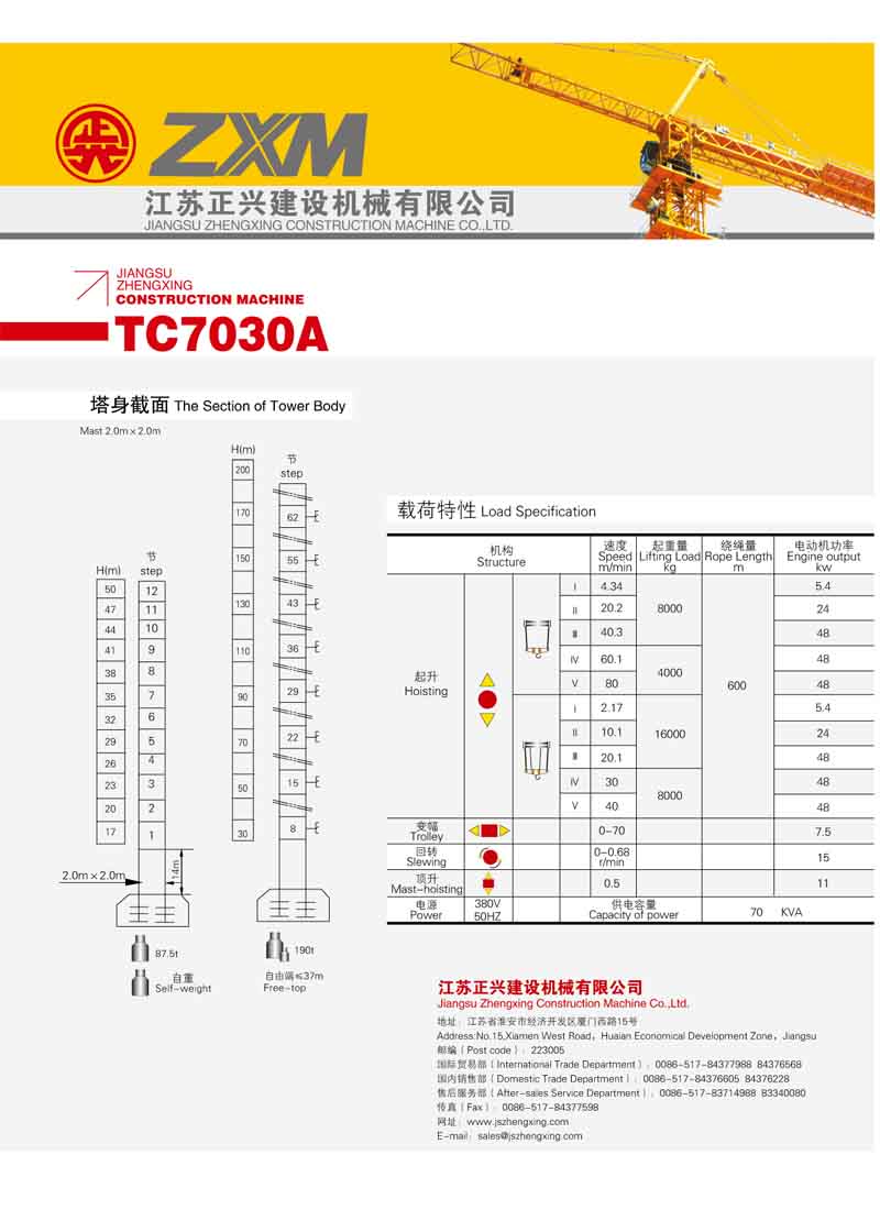 2、最大工作幅70米,最大起重量16噸,末端最大起重量3.0噸,額定起重力矩2500KN.M;